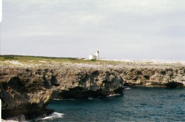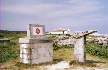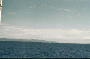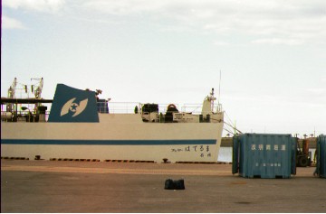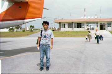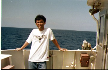 波照間島と筆者兄ちゃん面白いか?と船員の方から冷やかされました。写真を 撮ってもらいました。操縦室の上に上がることが出来、そこで寝ながら眺める八重山諸島の風景は 最高でした。