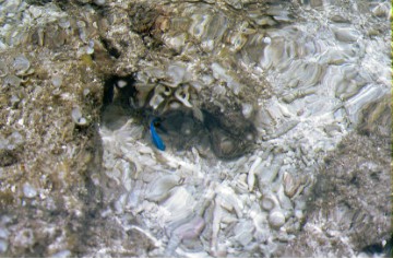 波照間島の海エメラルドブルーのここが本当に日本かと疑いたくなるような 美しい海です。エメラルドブルーの所で急に海が深くなっています。 その境目には熱帯魚がいっぱいおり、競泳用の水中眼鏡で普通に 泳いでいるだけで見ることが出来ます。珊瑚も見れます。写真は 浅瀬を泳いでいる青い熱帯魚です。